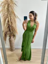 Blusa confeccionada em crepe texturizado, frente única, elástico no cós posterior e amarração no pescoço.