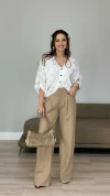 Calça confeccionada em viscose mista, garantindo leveza, conforto e fluidez ao vestir. A estampa listrada alonga visualmente a silhueta, enquanto a modelagem wide leg proporciona movimento sofisticado e moderno. O cós limpo cria acabamento minimalista e elegante, com fechamento lateral por zíper invisível que mantém a peça estruturada. Possui bolsos faca laterais, que adicionam praticidade sem comprometer o caimento. Uma peça versátil e estilosa, ideal para compor looks casuais ou mais arrumados, especialmente quando combinada com a regata Monique.
