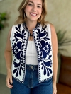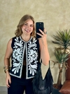 Colete confeccionado em algodão, forro, manga cavada e detalhes bordados.
