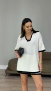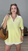 Conjunto confeccionado em tricot listrado, que une estilo e conforto em uma proposta moderna e atemporal. A camisa de manga curta possui gola polo e fechamento por botões encapados, trazendo um ar delicado e sofisticado à produção. O shorts complementa o look com modelagem confortável e caimento leve, ideal para dias de temperaturas mais altas. O tricot, de toque macio e estrutura firme, proporciona ótimo caimento e valoriza o visual com suas listras sutis e elegantes. Aposte em sandálias neutras ou rasteiras minimalistas para um look leve e casual, ou combine com salto bloco e acessórios marcantes para um toque mais refinado.