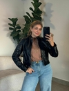 Jaqueta em corino, gola padre com fecchamento, detalhe acolchoado nos ombros, bolsos frontais, detalhes laterais trançados, forrada e fechamentos por zíper tratorado.