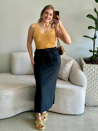 Essa saia combina conforto e estilo de forma casual e moderna. O cós alto é ajustado com um elástico e cordão para amarração, proporcionando um ajuste personalizado. Os bolsos faca laterais adicionam funcionalidade e praticidade, enquanto as fendas nas laterais garantem um toque de movimento e fluidez ao design. Perfeita para um look despojado, sem abrir mão da sofisticação.