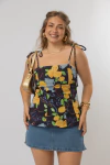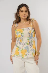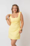 Vestido curto confeccionado em algodão, com estampa inspirada em limão-siciliano que traz frescor, leveza e um toque mediterrâneo ao visual. O decote quadrado valoriza o colo de forma clássica, enquanto as alças com detalhe em laço adicionam charme e delicadeza. O fechamento posterior por zíper invisível mantém o acabamento clean e elegante. Totalmente forrado, oferece conforto e segurança ao vestir. Uma peça alegre, feminina e perfeita para dias iluminados.